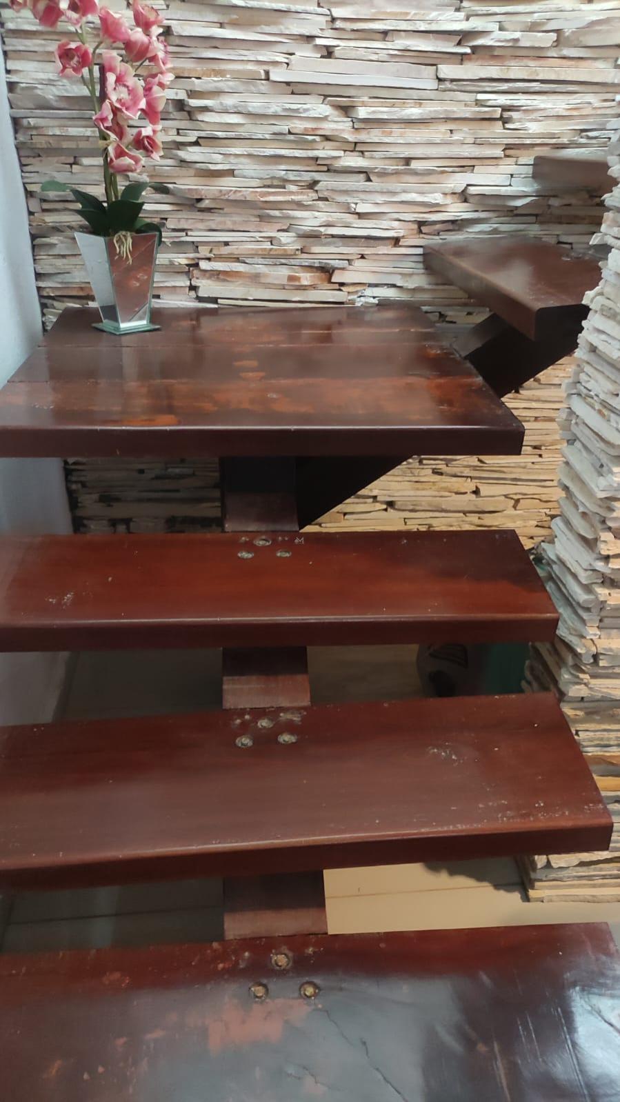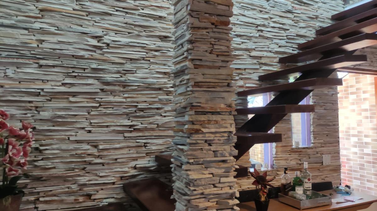 Sala aconchegante com decoração em pedras e madeiras de Massaranduba, trazendo charme e elegância.